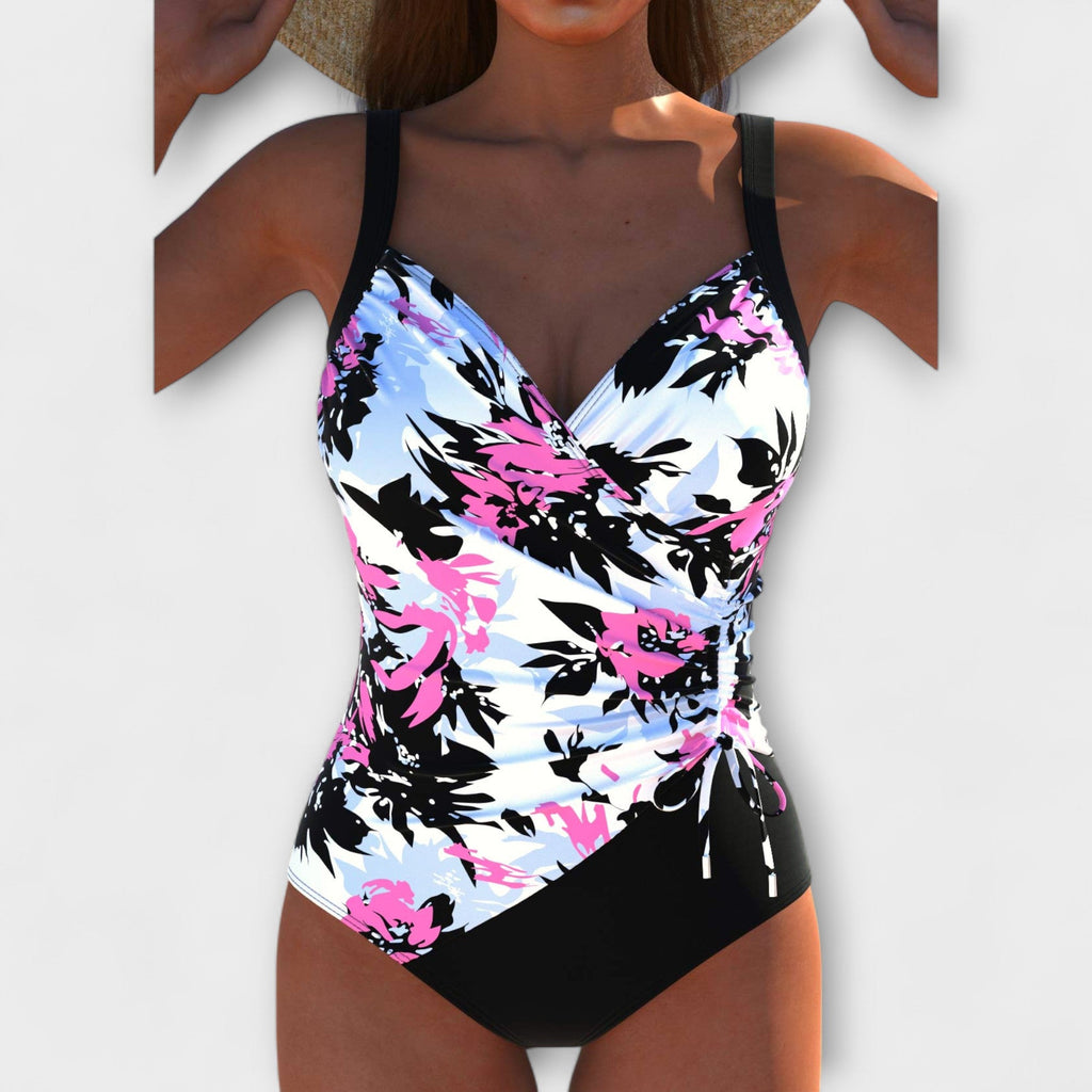 Make a splash with the eye-catching Miya swimsuit! Its vibrant, colorful print draws all eyes, while the round neckline and gathered details accentuate your curves. Made from high-quality stretch material, it moves with you. Perfect for lounging by the pool or beach adventures.